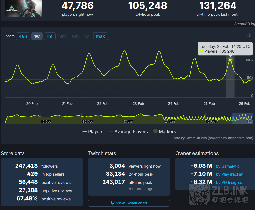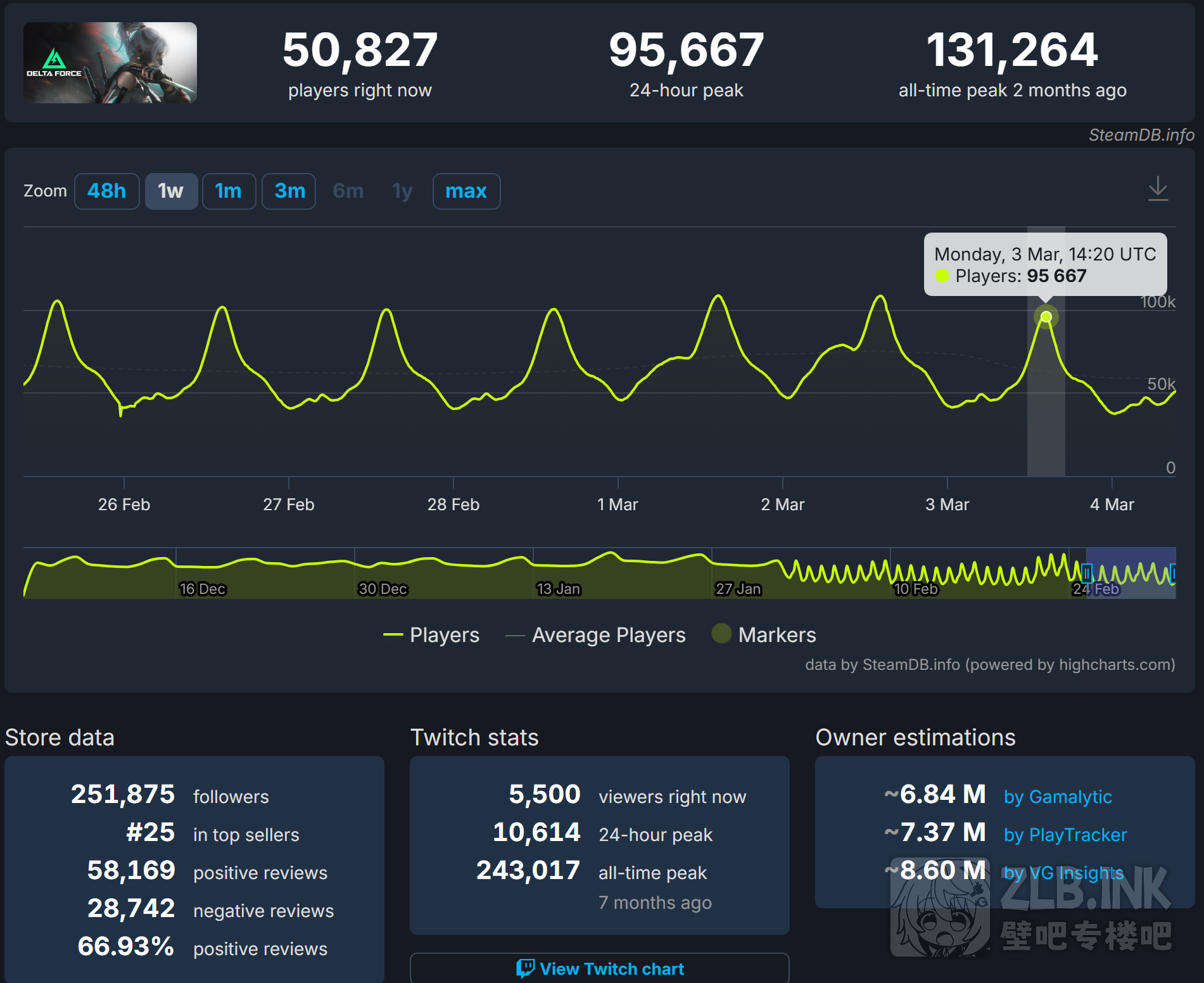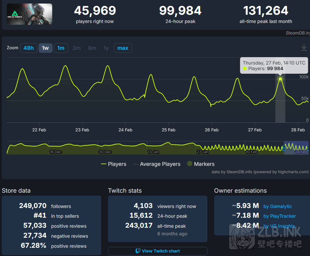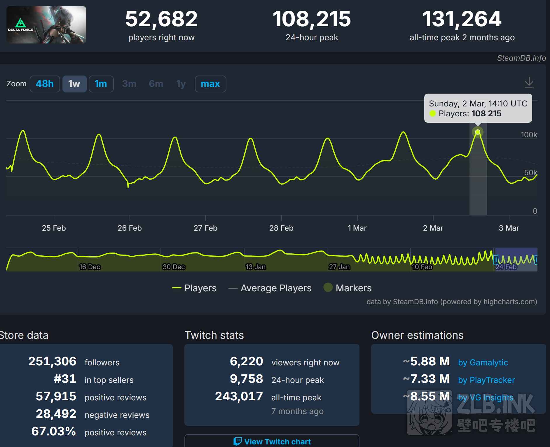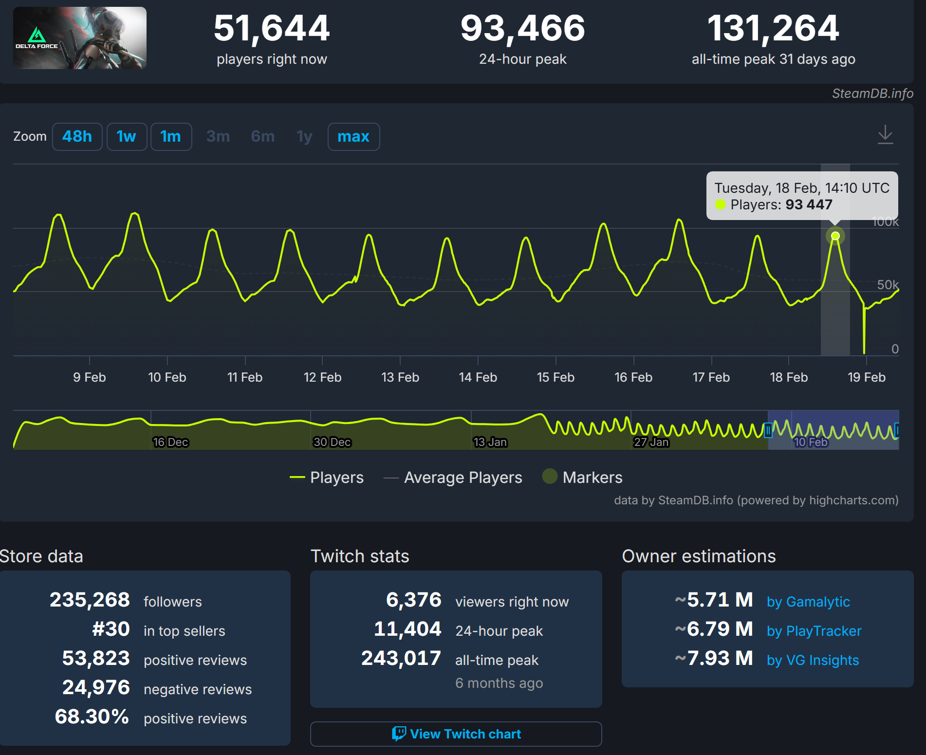 但众所周知,三角洲行动(Delta Force)是一款多端游戏,即使上了自家的wegame但还是没放过上steam的机会。在持续不断的宣发下,只观察ios榜单的人看到了高畅销榜排名,但不去考虑走高的免费榜排名。因此,在透明的steam榜单中能看到游戏人数的涨跌趋势,能够有效看出游戏的热门趋势。