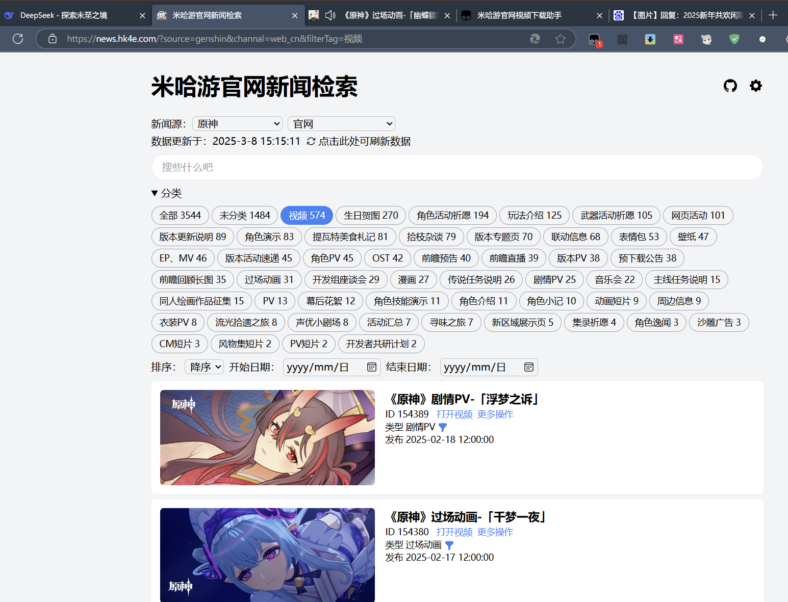 此处推荐壁吧吧友制作的一个米哈游官网聚合网站,可以一站获取所有游戏官方发布的内容,也能在分类里筛选出视频:米哈游官网新闻检索