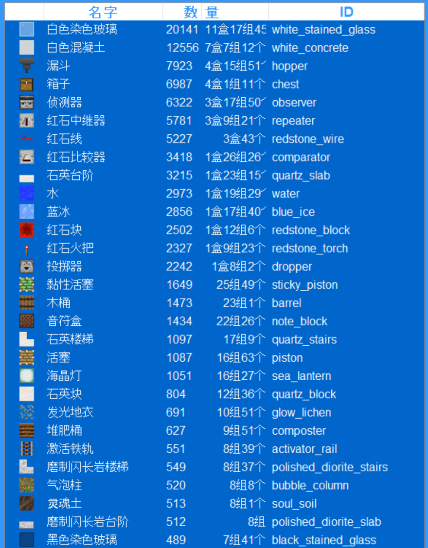 需要填充的原料有石头/粘液块/火药/烈焰粉/地狱疣/空瓶,每种需要的量都在6盒左右,也就是6*1728个物品。这些原料用于自动炼药机生产虫蚀药水和渗浆药水。