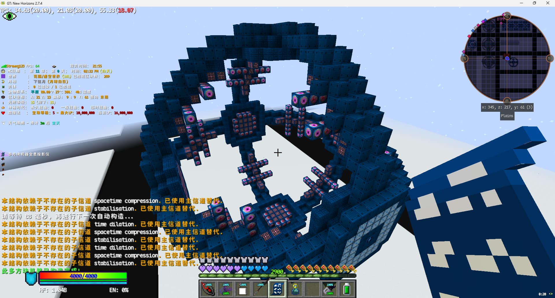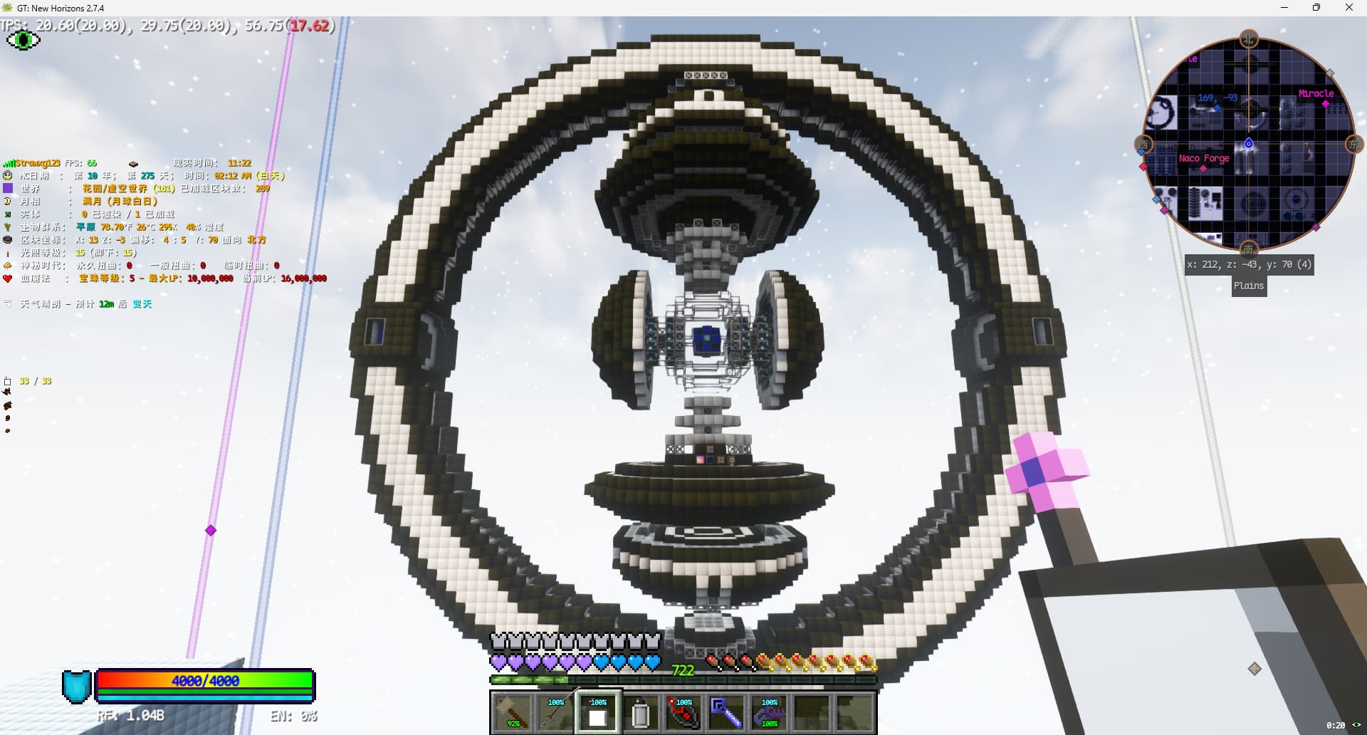 中途有个小插曲,建造完本体后,为了确认对门是否有出现问题,我使用了8个角落的传送门,但发现无论我如何调整主世界传送门的y轴高度,只要使用距离猪人塔中心点16格以上的传送门,都会在主世界生成新的传送门。