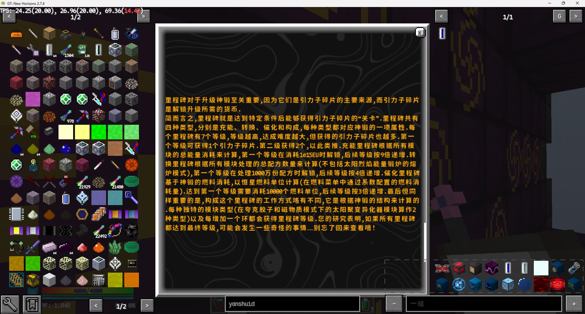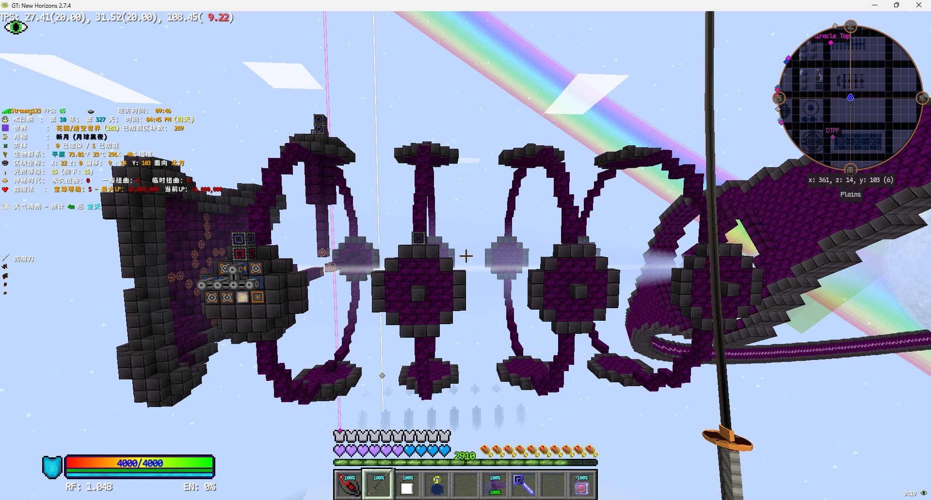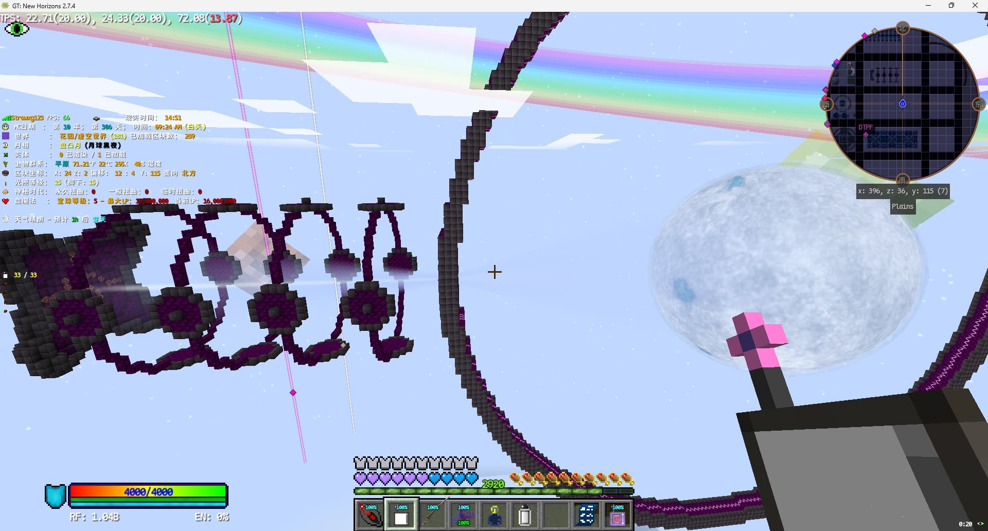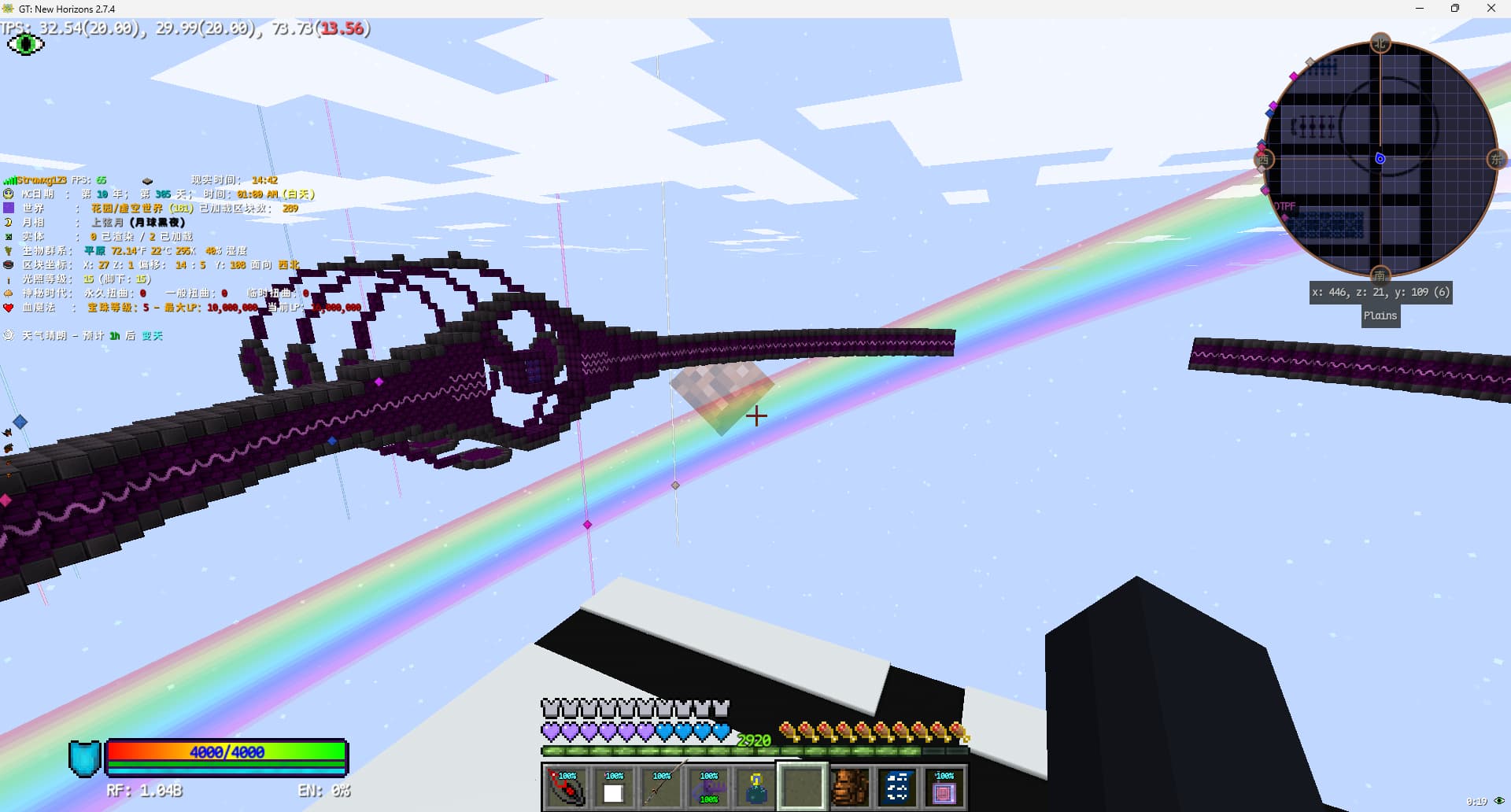 上个存档的所有工程离家都没有这么远,也就没心思研究交通。在这个存档算是刚需了。打算实装一台小型的珍珠炮,其能将单维度的活动范围扩大到半径10000格,从地狱映射到主世界就是80000格。返程就使用基于物品id的珍珠传送站。