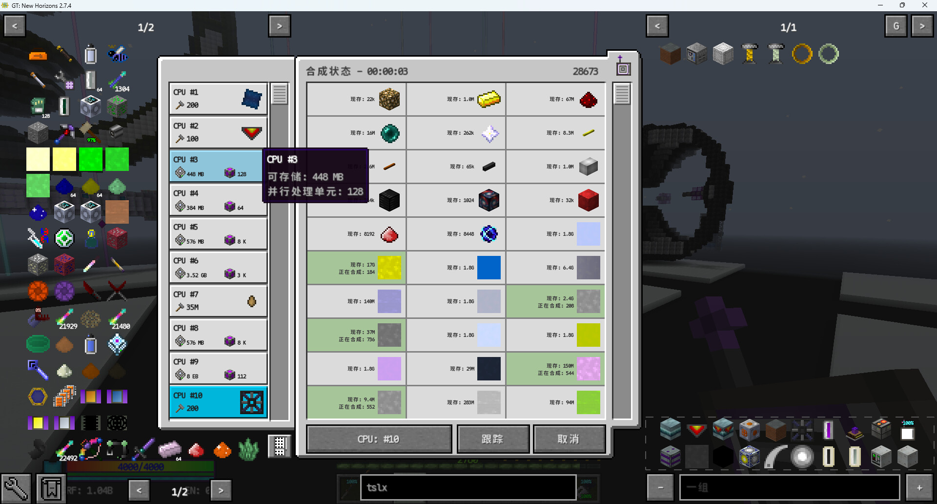 卡速度的原因是,GTNH中的能量模块(数量大耗时长,合成的制作量高达20M,zpm电压条件下要100s,哪怕是更高级的进阶装配线,做128个也要70.5s)