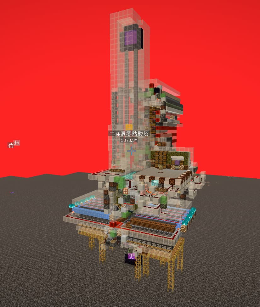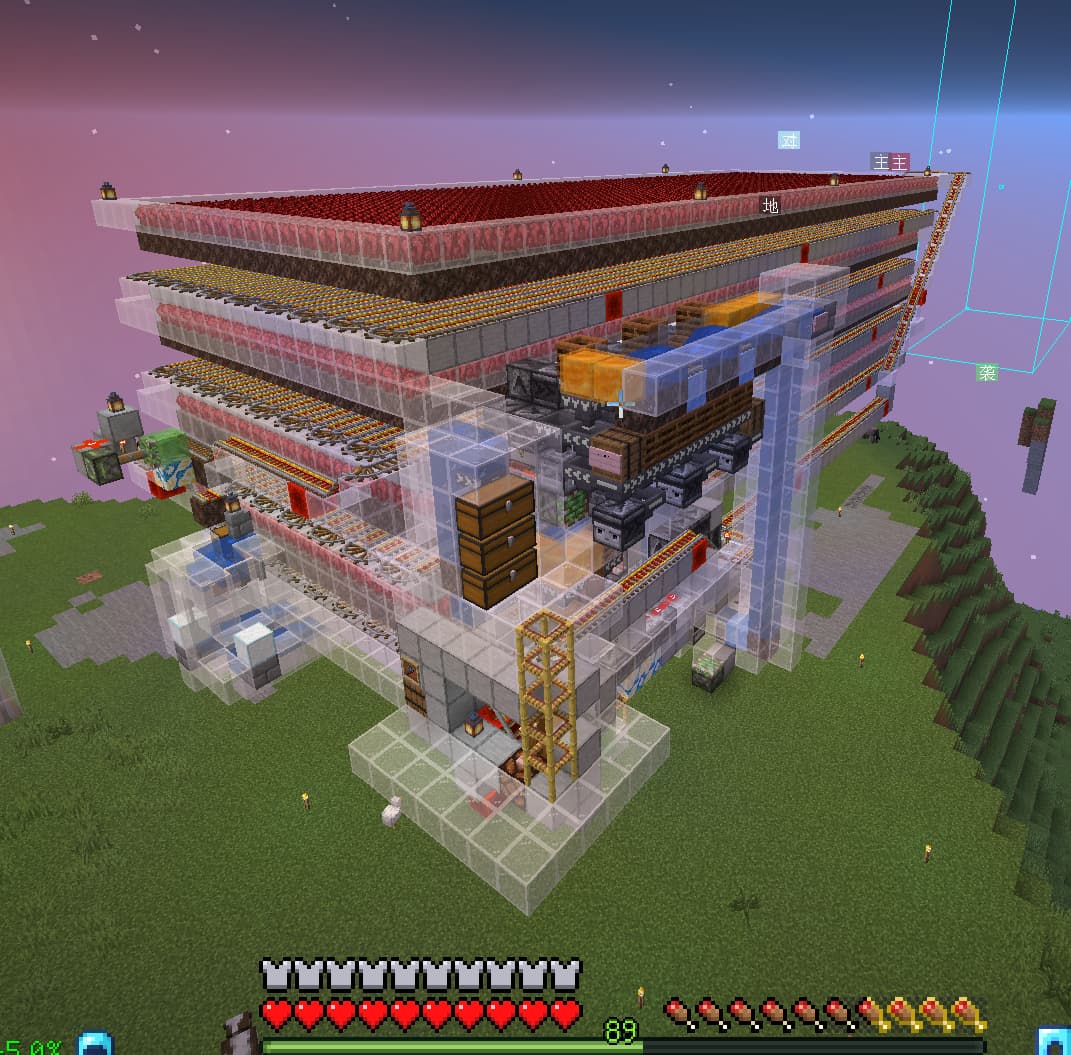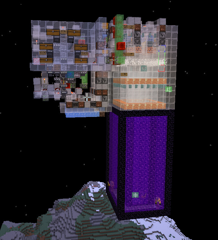 收集有一些问题,虽然没有采用矿车分流,减少了一些填充容器的工作量,但地狱门框架中刷出的猪人也会在这里被处死。这会导致猪人的产物错误混入合成器中,从而无法合成粘液块。所幸,设计收集效率是百万,而实装的降频史莱姆农场达不到这个效率,即使有合成器被堵住,也不会导致收集不过来;其次,这台收集装置的操作面板没有放在合成器的正下方,所以我用脚手架在此处搭了一个平台,即使机器真的堵住了,也可以使用投影打印机的容器同步功能清除合成器中的异物。