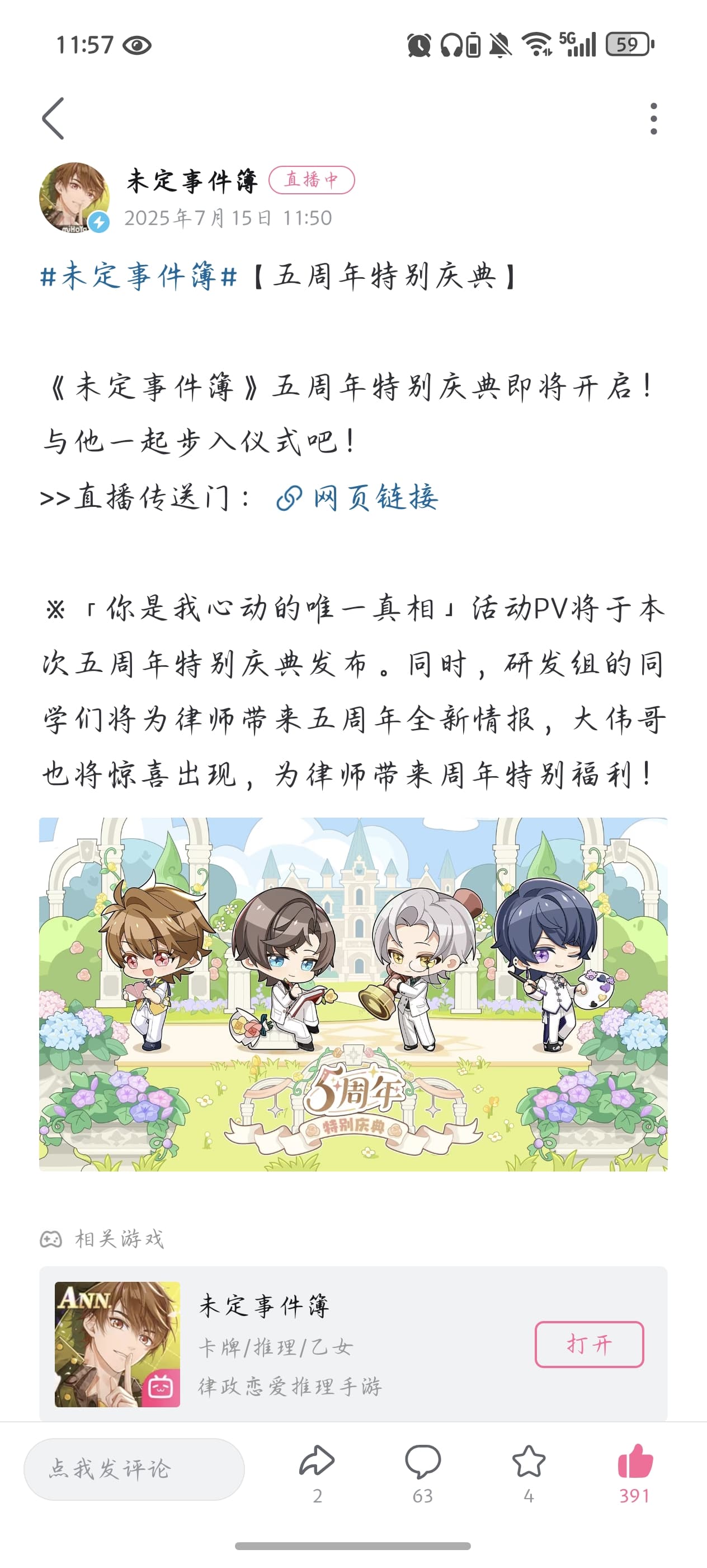 首先是未定镇楼,未定是我玩的第一个二游,也是因为它我认识了原神认识了米哈游,现在有时候回头想想还是很开心自己当初在预约榜里看见了它(唯一不好的就是官服b服两个号中最后选择了开服更欧的b服)。其实乙游从五年前到现在依旧不是我的菜,未定从一开始吸引我的标签也是律政侦查,所以能互相陪伴到现在也真是太不容易了,希望还能一直走下去,从一周年的告白到今年的结婚,我焦虑也期待着每一年新的主题,期待着未定的又一次进步 ෆ( ˶’ᵕ’˶)ෆ