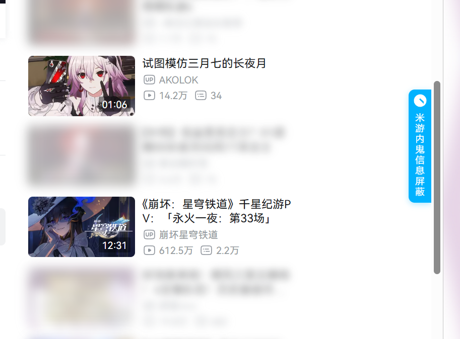 大家可能都在被平台不断推送内鬼、黑流量视频所困扰。之前有空有闲,写了一个浏览器扩展“米游内鬼信息屏蔽”,可以在常用网站上屏蔽米家游戏相关的内鬼和黑流量视频,支持B站、推特、Youtube。现已上架Chrome商店和Edge商店。
