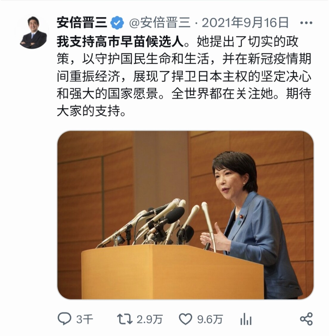 然后是修宪:她强烈要求修改宪法。为了尽到对生活在现在的日本人和下一代的责任,以制定符合时代需求的’新日本国宪法’为目标。