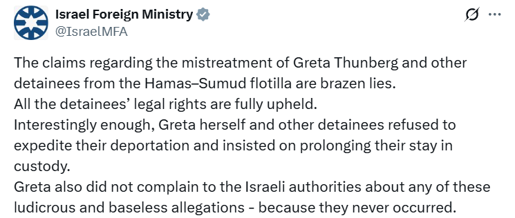 被释放的格蕾塔·通贝里在希腊发声:“关于我们在监禁期间遭受的虐待和侵害,我本可以滔滔不绝地讲上很久很久,请相信我,但我们个人的苦难并非重点。事件核心不在于施暴者,而在于加沙人民的苦难。我们并非英雄,我们所做的不过是杯水车薪,但这是迫不得已的最后手段,这项任务必须存在,我们只是在做最起码的事,呼吁世界各地的人们采取行动,终止这种的共谋行为。”