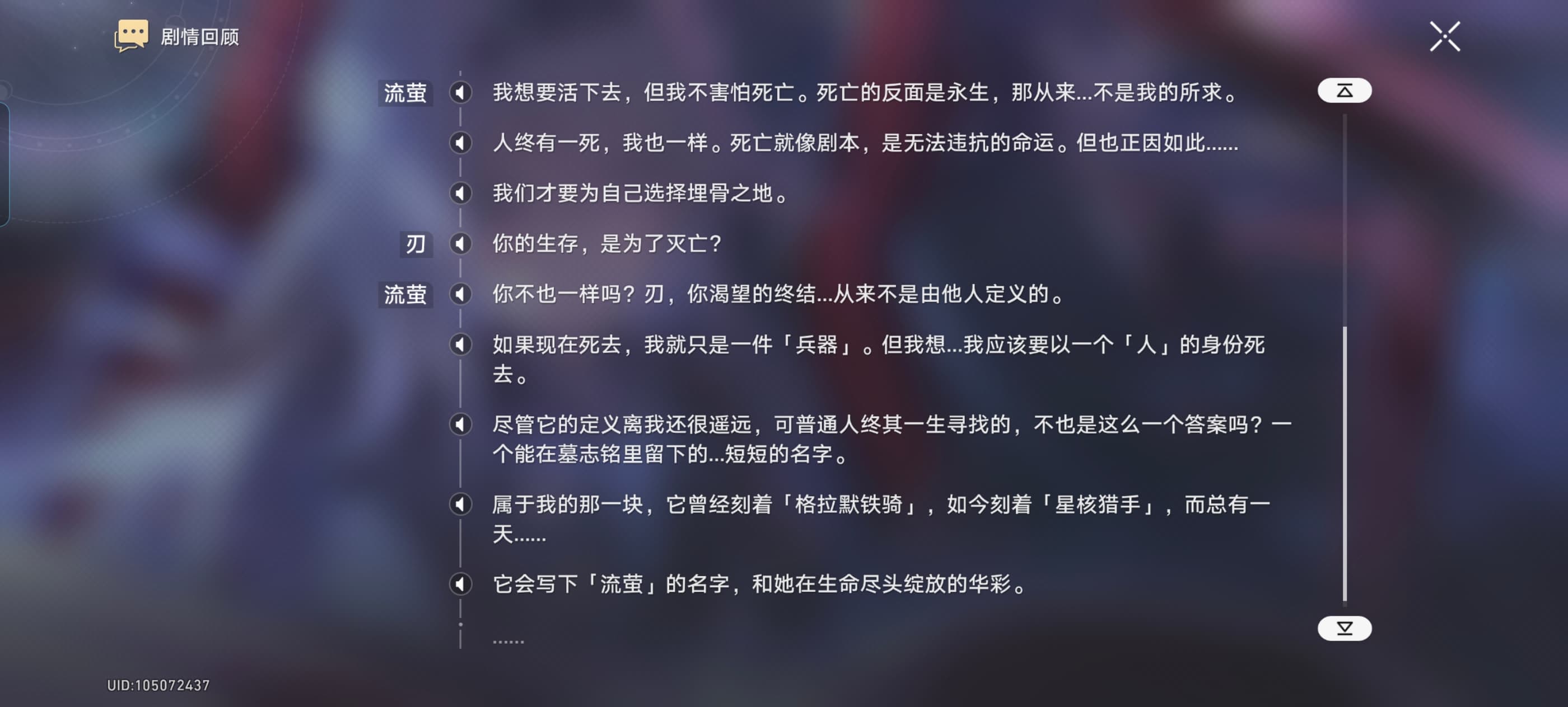 最后总结下来这段剧情真的是整个翁星剧情优点的一个缩影 对一位角色的叙事实则与遗器文本、世界地图、剧情主线结合在一起 同时实现了遐蝶的人物弧光、那刻夏的轮回说验证、缇安万敌的再呼应、死亡火种的回收、岁月的试炼、对凯妮斯幻梦的击破并进一步深化逐火之旅的意义 世界的逐火是每个人在自己道路上逐火的集合 所以我还是想说:在现有的剧情结构下同行任务这个模式已经落伍了 翁星要求玩家对每个角色都有完整的了解 这有利于角色ip和整体ip的塑造