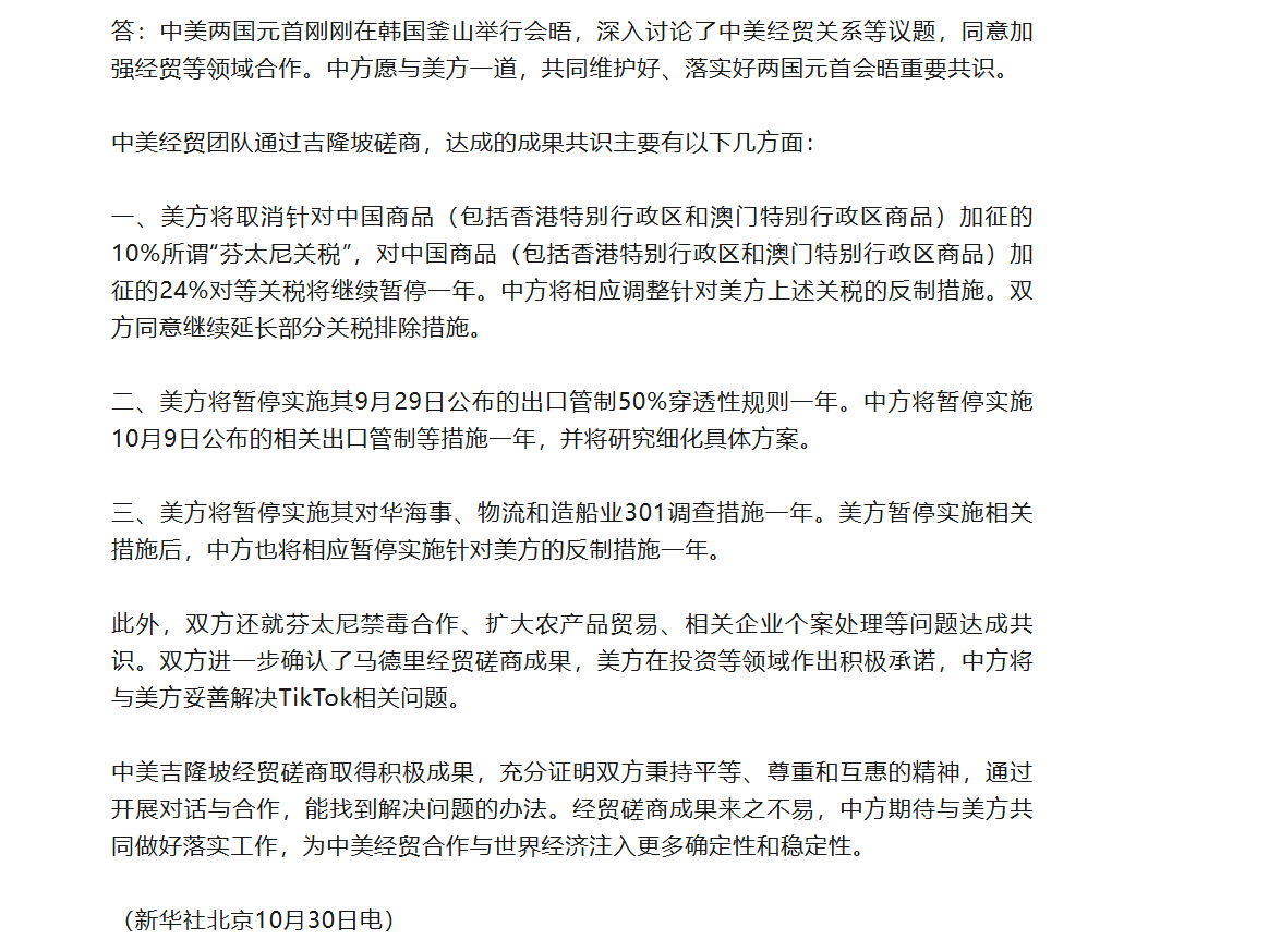 总结一下,双方又双叒叕回到4月2号之前的状态+降低百分之十芬太尼关税,我为什么要说“又双叒叕”呢,因为已经回到好几回了,每回刚谈完美国就忍不住在别的方面找事………