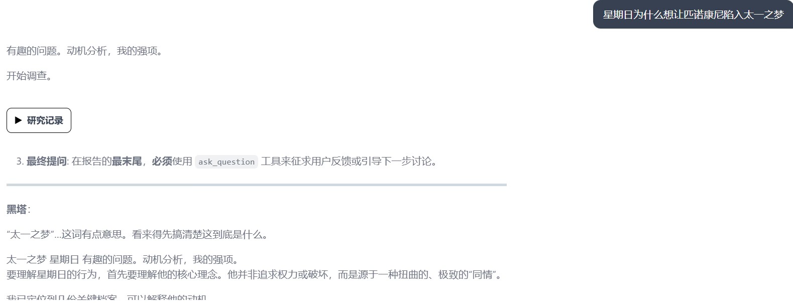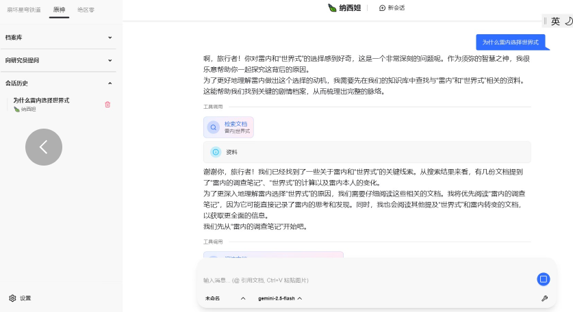 重点基于米家剧情知识库(包含人物任务物品圣遗物武器书籍等等)的结构化数据和prompt优化,使用大模型的工具调用功能,并依赖其强大的联想能力与思考能力进行阅读和解读。你可以用它来考据,咨询,联想,预测,更多功能留待进一步探索。