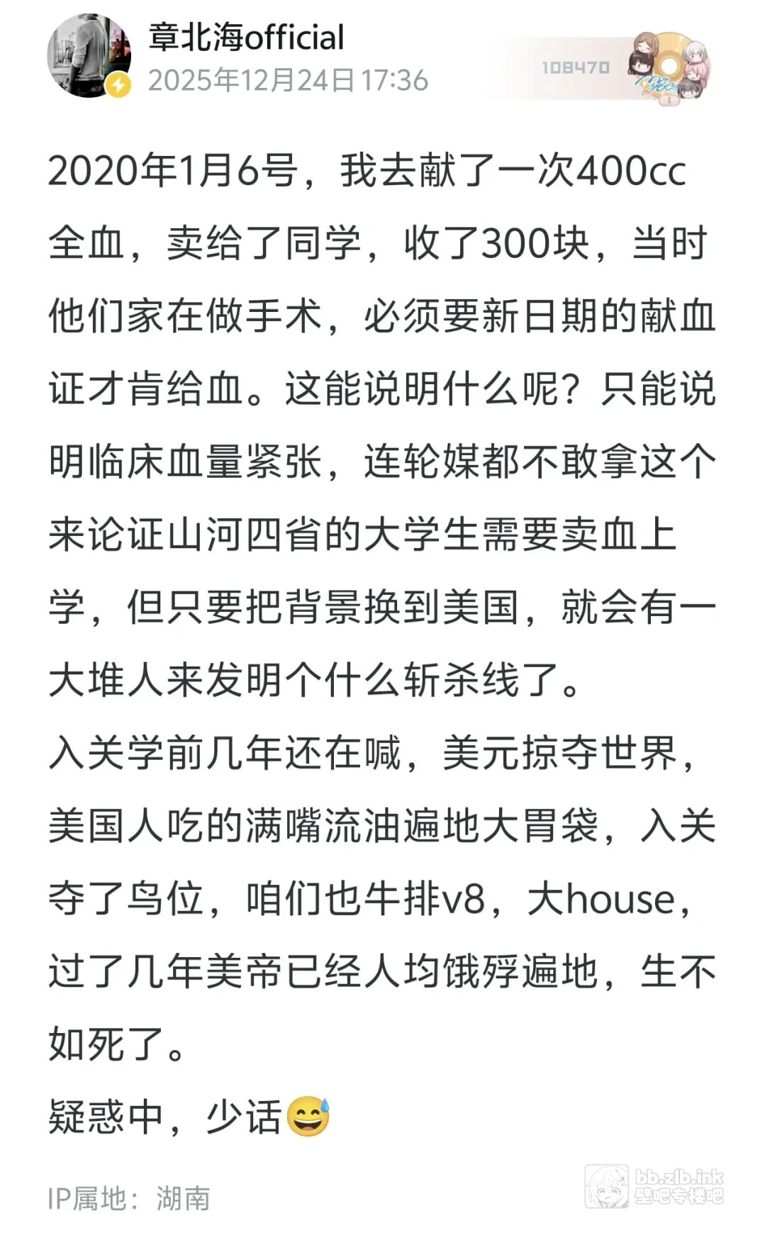 夸大肯定是有的,但美国肯定有斩杀线之类的现状。现在知乎某些问题下面罕见团建+何不食肉糜的偷换概念和昨天晚上章北海offical的动态哈气,那还能说啥呢,不利于润的话不要说。