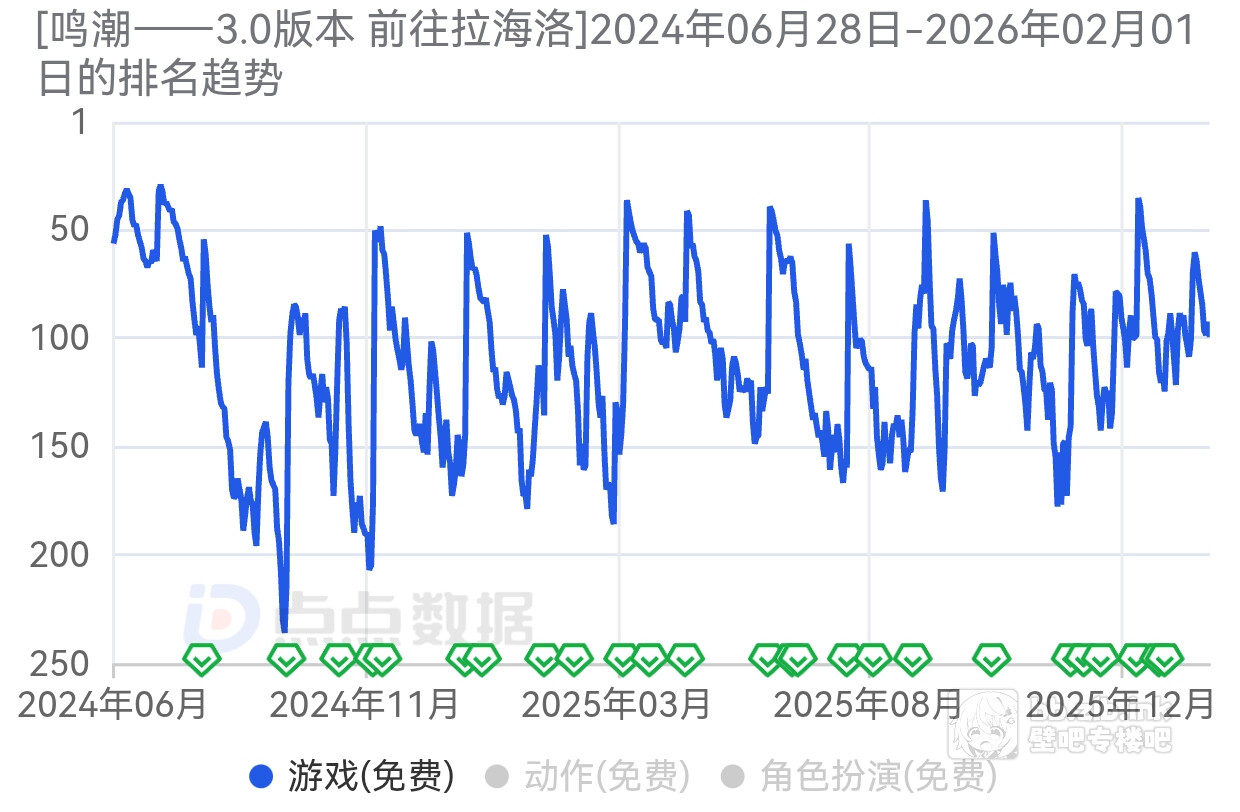 2.0~2.7版本版均增量192.4,增量前高后低,2.3版本中期翡翠卡池后免费榜显著降档