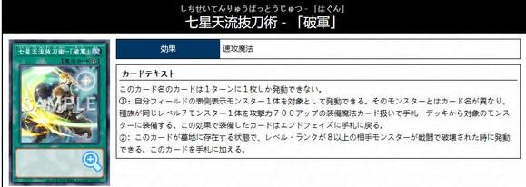●自己场上有1~6星怪兽全部存在的场合才能发动。宣对方场上1只表侧表示怪兽,等级·阶级·连接数值和那个等级相同的,选的怪兽以外的对方场上的怪兽全部破坏。