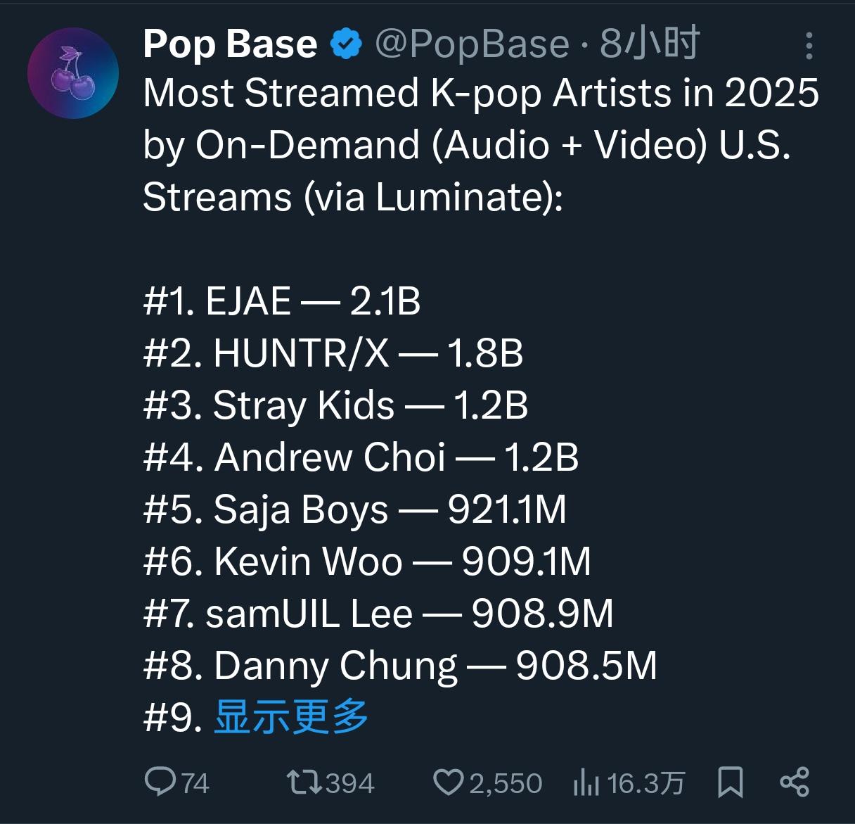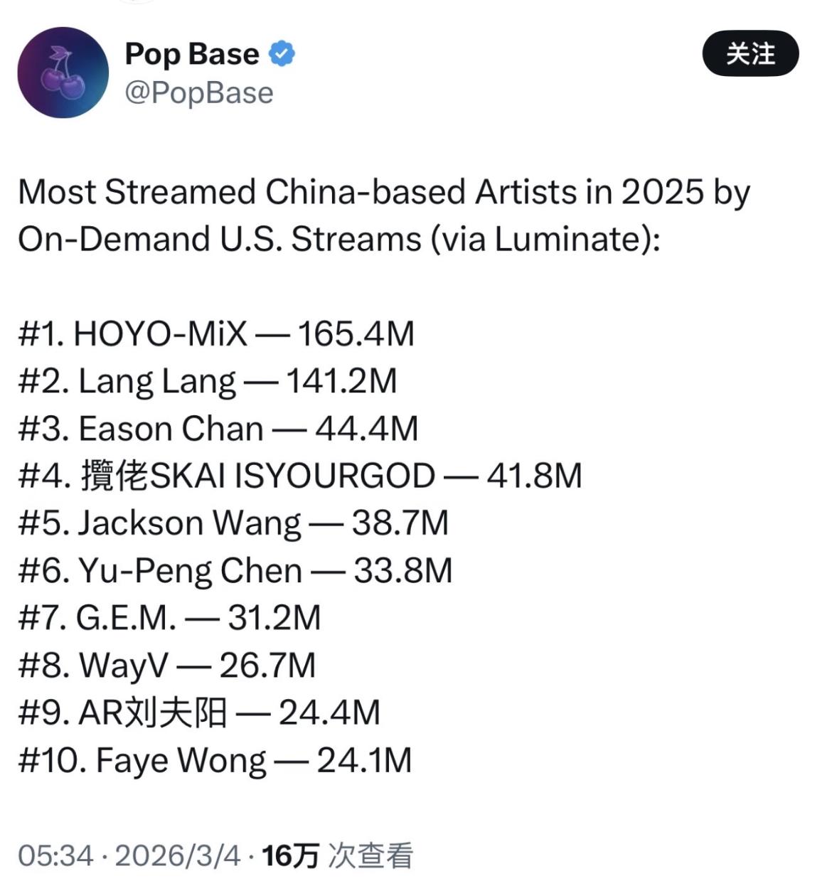 翻译如下:2025年美国点播平台(通过Luminate数据)上最受欢迎的华语艺人: